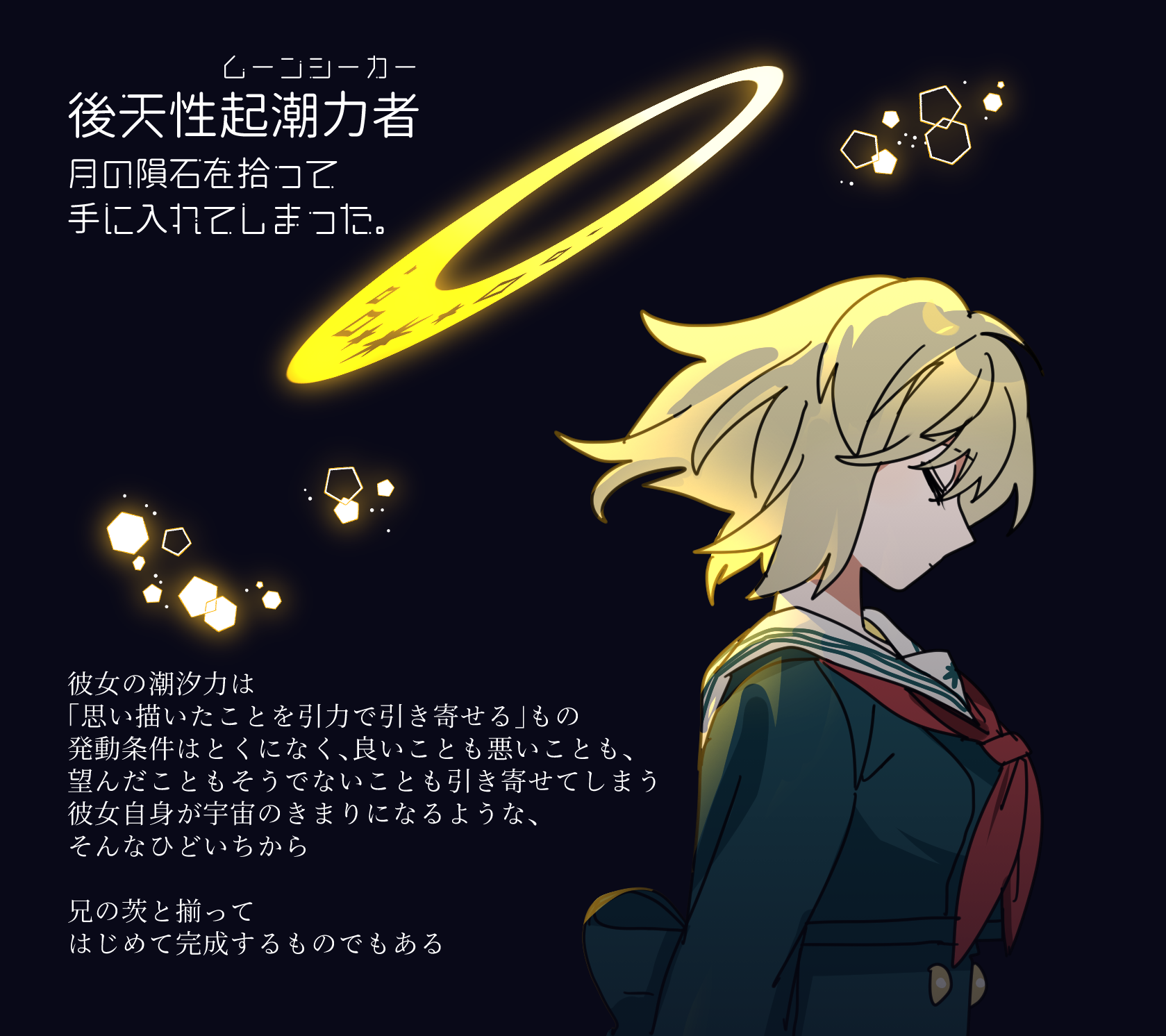 原初のムーンシーカーたる小百合の力は上記の通り。彼女自身が「惑星」になるみたいなもんだと想定している。すっごく平たく言えば小百合の力は「引力」で、FANBOXで無駄に伏せていた茨の力は「斥力」。二人が揃うことに意味があると良いとずーーーーーーっと思ってる。ただ最後の方で小百合の本当の力は「重力」だったんだ! とかなるといいなとかも考えてるけど落とし込めるかな~