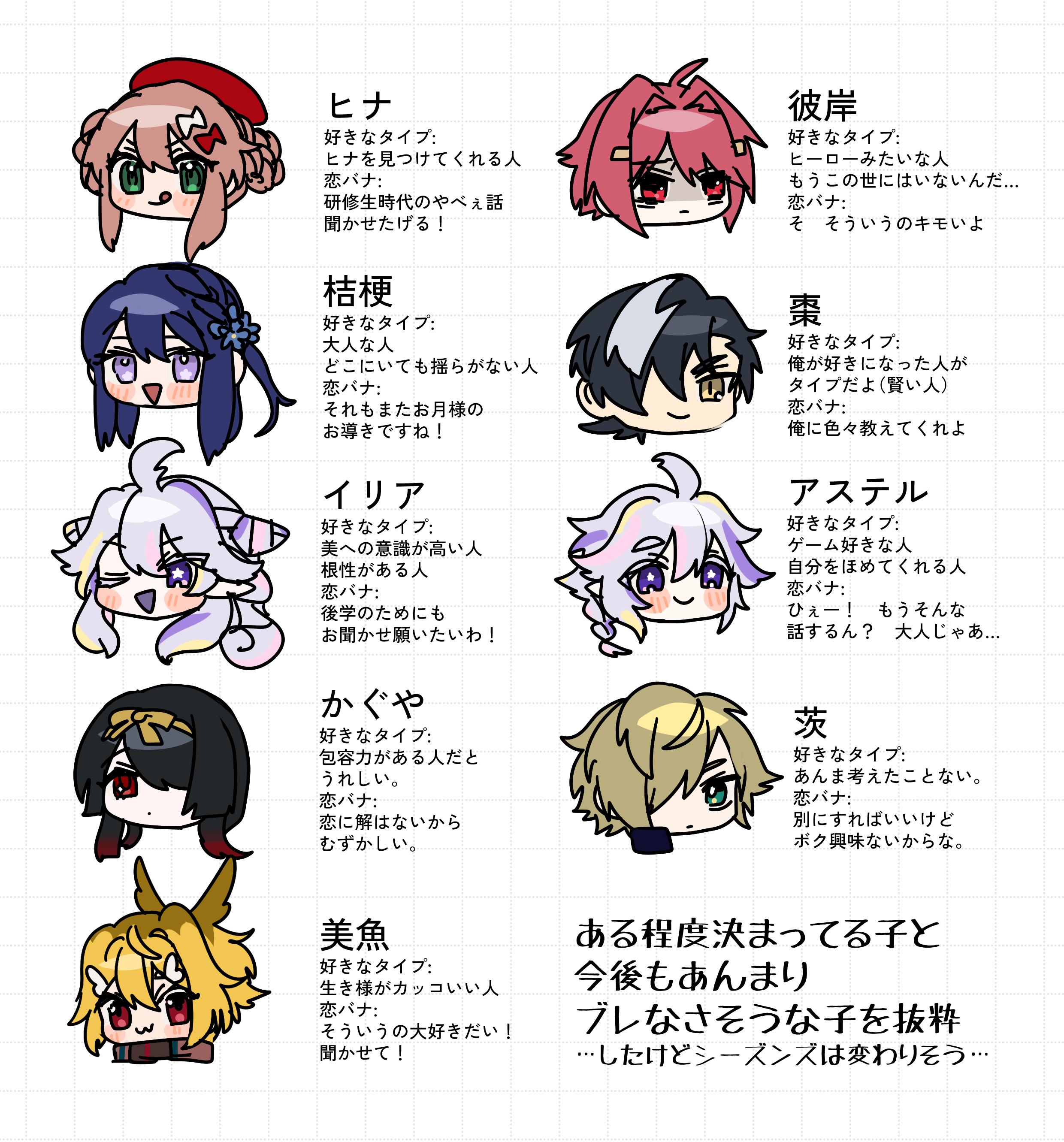 高校生だけを選抜した…んですが、まずアステルは中二でした。春夏秋冬キーキャラクター全員選出したい欲が勝っちゃった、、また、一部高校生を省いているのは町内名簿のものより大きく変わったりしそうなためです…! 本当に未定が多すぎて申し訳ない……あと、転生体たちやかぐや代表、美魚など学生じゃない子もいます😅