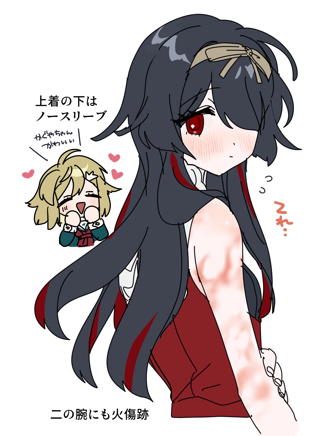 火傷跡のアレコレです、白衣脱いだらノースリーブかぐや描けて嬉しい あと、スカートの柄は花札の「月」です