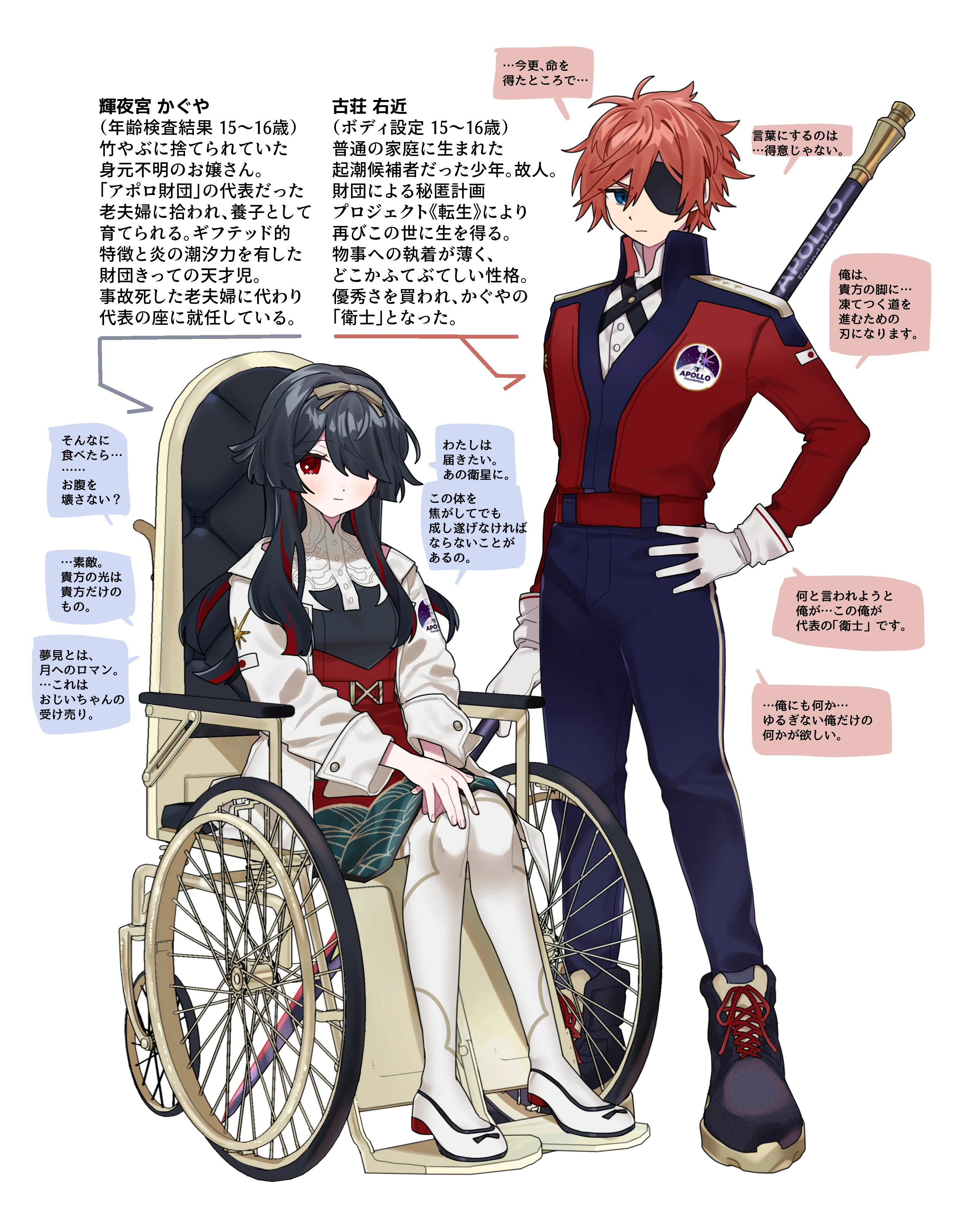 そんなこんなでこのふたりは本編でのアポロ財団の象徴コンビですが、敵という訳ではなく、味方寄りの存在になるんじゃないかなと思ってます! アポロ財団自体がかぐやの起こしてしまった事件以降しっちゃかめっちゃかの超絶いびつな構造となるので、敵と言える財団と味方と言える財団がいて、かぐやたちは後者って感じです。