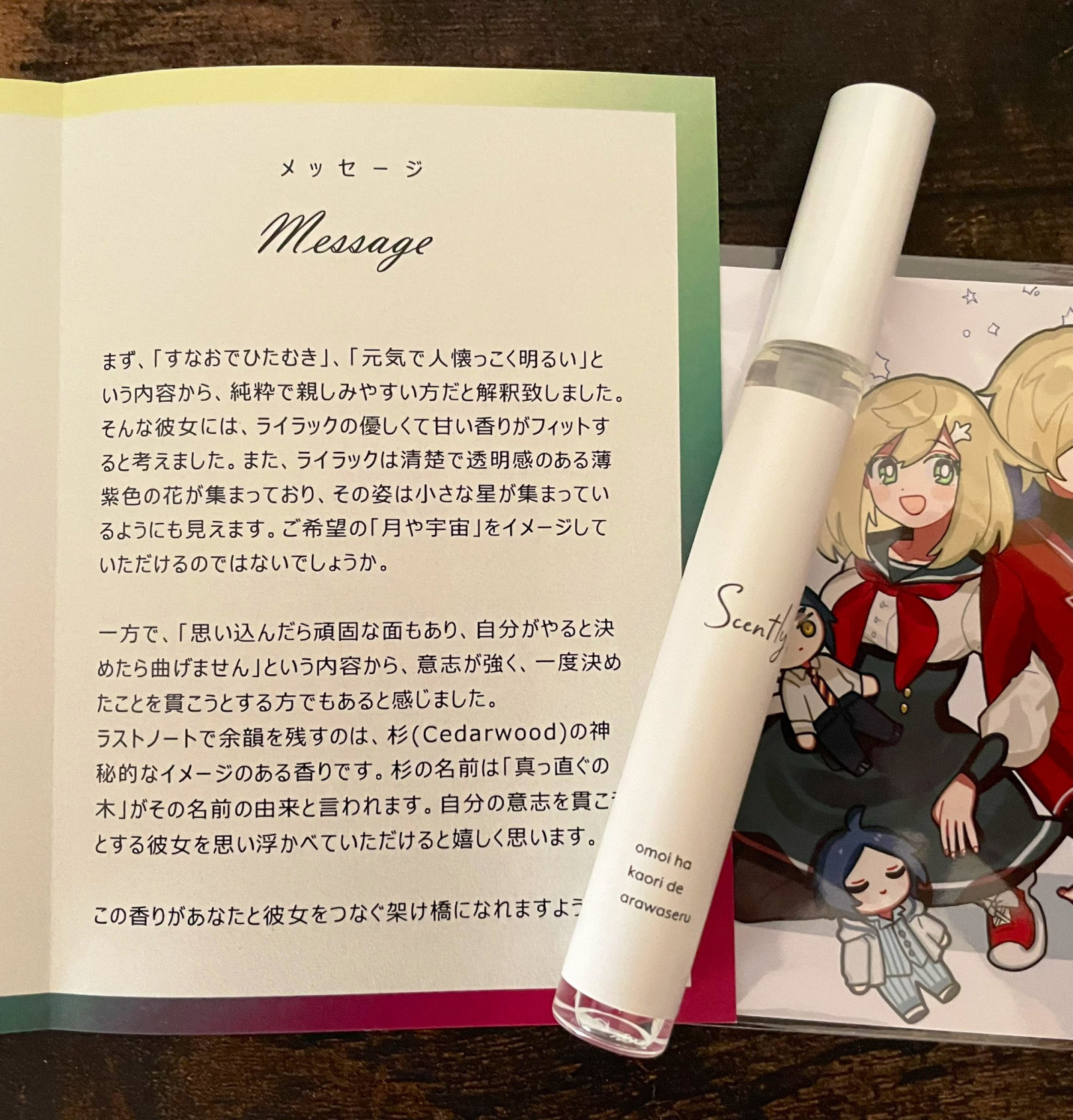 推し香水といえばScently. ご記入頂く香りオーダーシートから、あなたの推しの解釈を読み取り、「調香師とこだわり抜いた香り」をお届け。一通ずつ香りの解釈を記載した、香り解説レターもおつけします。税...