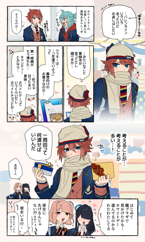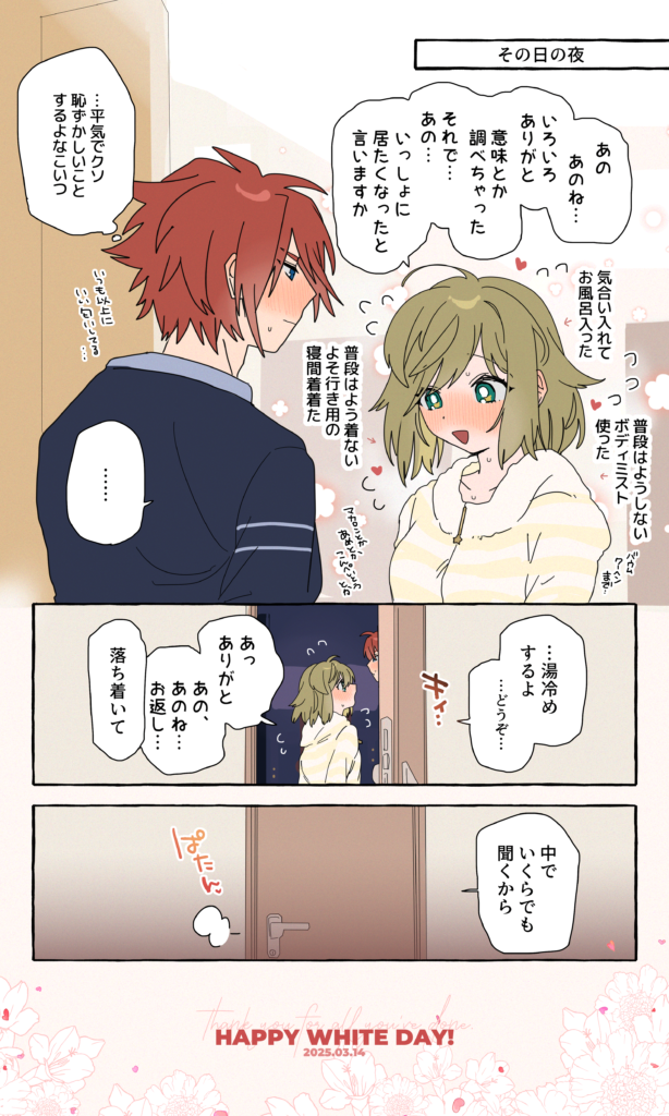 あとは合間合間で落書きをしています。ホワイトデーの絵なども描きました。バレンタインデーは月が丘のイラストでしたが、ホワイトデーは推しカプまこゆりです。幻覚げきつよ。4ページ。