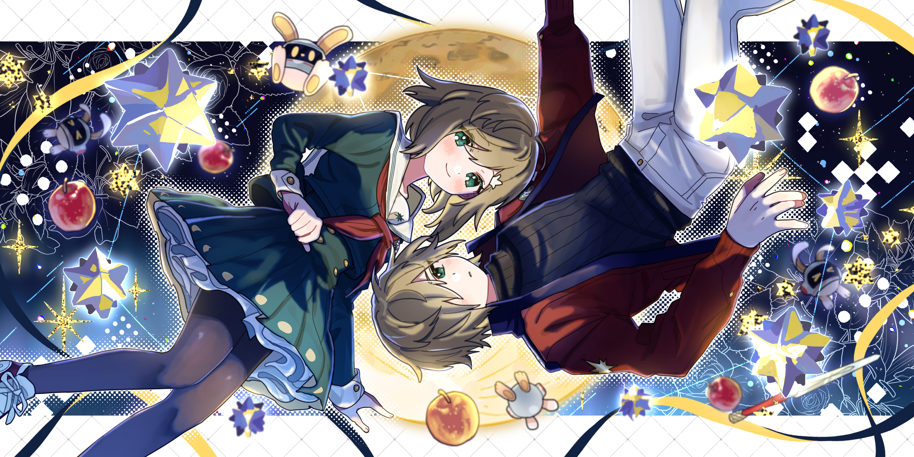 元々こっちの構図で描いてました。土壇場でタテの方がいい!? って変えた…もったいないので! りんごは小百合の好物なのと、双子の裏テーマがアダムとイヴみたいなところがあるので、知恵の実…的なアレでも大事にしたくて! おうごんりんごは、レクリン作ってた時に考えてたアイテムです。めっちゃ回復する。
